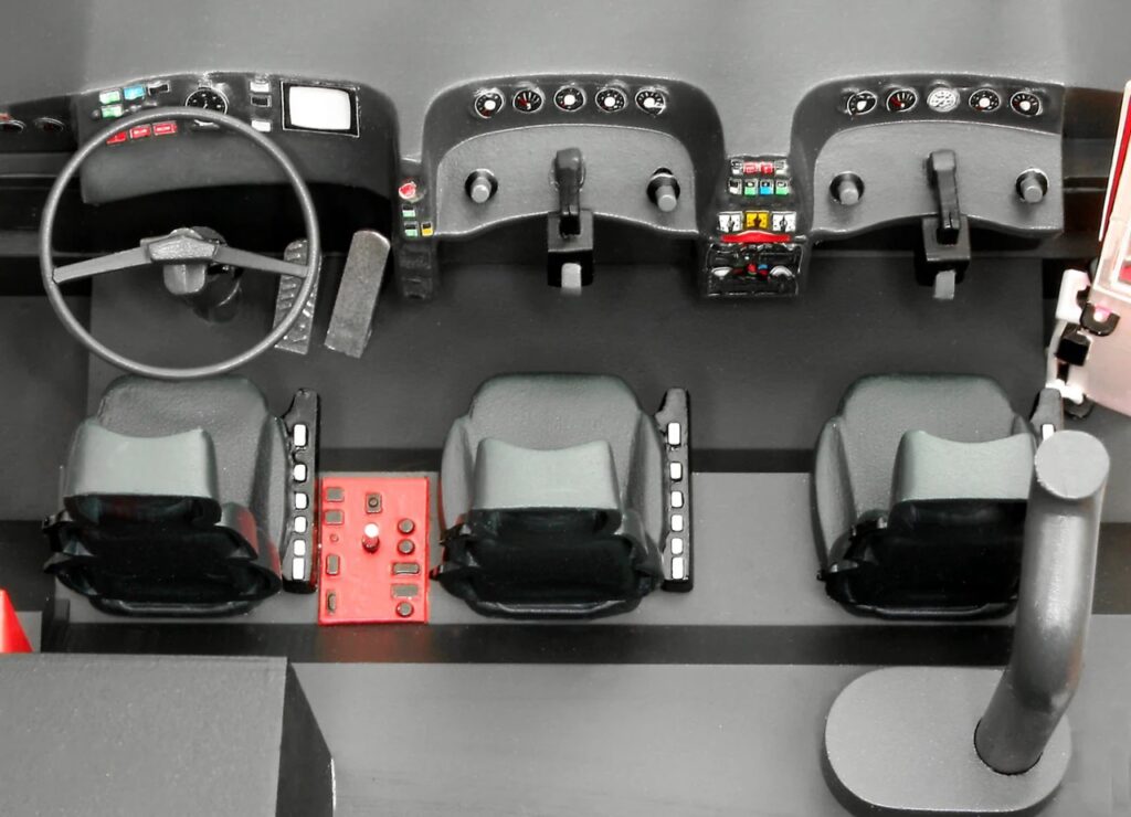 Stellt euch vor, ein Koloss mit zwei 600-PS-Turbodieseln die über Allison-Getriebe acht Räder antreiben und die fast 50 Tonnen von null auf 80 km/h in 21 Sekunden beschleunigen. Das ist der Simba 8×8 im Original. Er schleppt 12500 Liter Wasser 1500 Liter Schaum und 500 Kilo Pulver mit sich während der Löscharm 3500 Liter pro Minute speit. Die Kabine aus Stahl und der Aufbau aus glasfaserverstärktem Kunststoff sorgen für die kantige Optik die im Modell nach perfekter Lackierung und Wettereffekten verlangt.